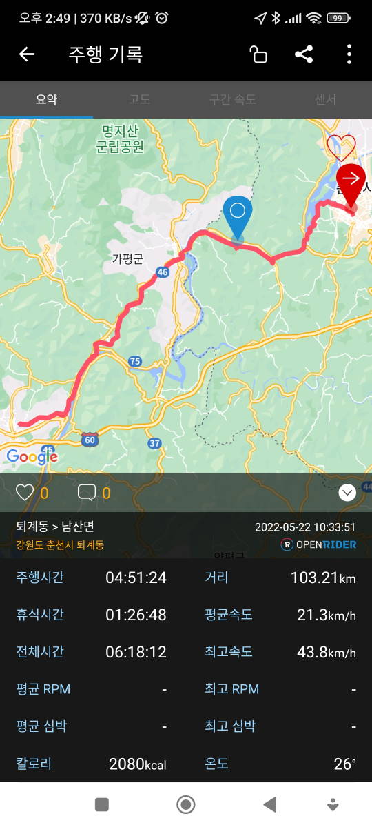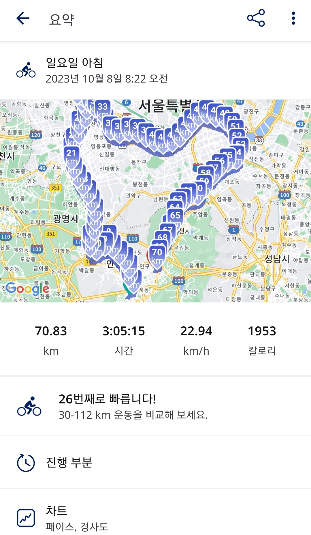 오랜만에 한강을 일주했습니다. 안양을 출발하여 여의도 > 잠실 > 과천 > 다시 안양으로 돌아오는 약 70Km를 일주하였습니다. 준비를 제대로 하지 못하였고, 초반에 너무 힘을 다 써서, 후반에는 체력이 떨어져서 엄청 힘들었네요. 아침을 간단하게 먹고 출발했어야 했고, 중간에 먹을 간식거리를 충분히 챙겨서 갔었어야 했는데, 물 1통과 두유 2개만 갖고 갔더니, 중간부터 너무 배가 고파서 힘을 낼 수가 없었습니다. 후반에는 힘들어서 사진을 찍지도 못했네요. ^^;