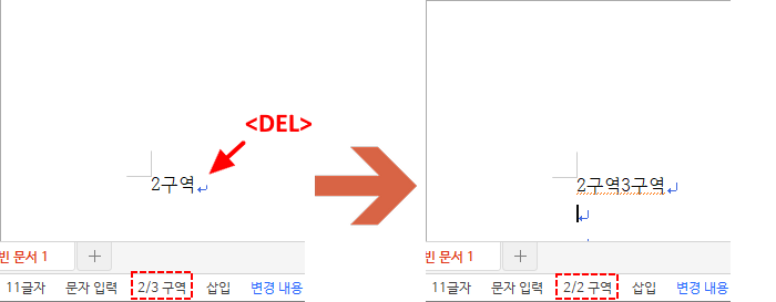 개요 한글로 문서를 작성하다가 보면, 쪽번호를 새로 매겨야 한다던가 용지의 방향이나, 종류를 바꾼다던가 새로운 머릿글이나 꼬릿글을 이용해야할 경우가 있습니다. 이런 경우에 필요한 것이 "구역 나누기" 입니다. 본 글에서는 한글 편집기의 "구역 나누기"의 활용 방법에 대하여 설명 합니다. 구역 나누기 구역 나누기는 한글 2022 기준으로 "쪽 > 구역 나누기" 메뉴를 선택하여 현재 입력 위치를 기준으로 나눌 수 있습니다. 단축키를 이용할 때는 "Alt + Shift + Enter"를 동시에 누르면 됩니다. 그러면 현재 입력 위치 이후로 새로운 구역이 생성됩니다. 새로운 구역이 생성되면 다음 그림과 같이 하단 상태바에 구역 정보가 "1/1"에서 "2/2"로 변경되는 것을 확인할 수 있습니다. 구역이 나뉜 상..
